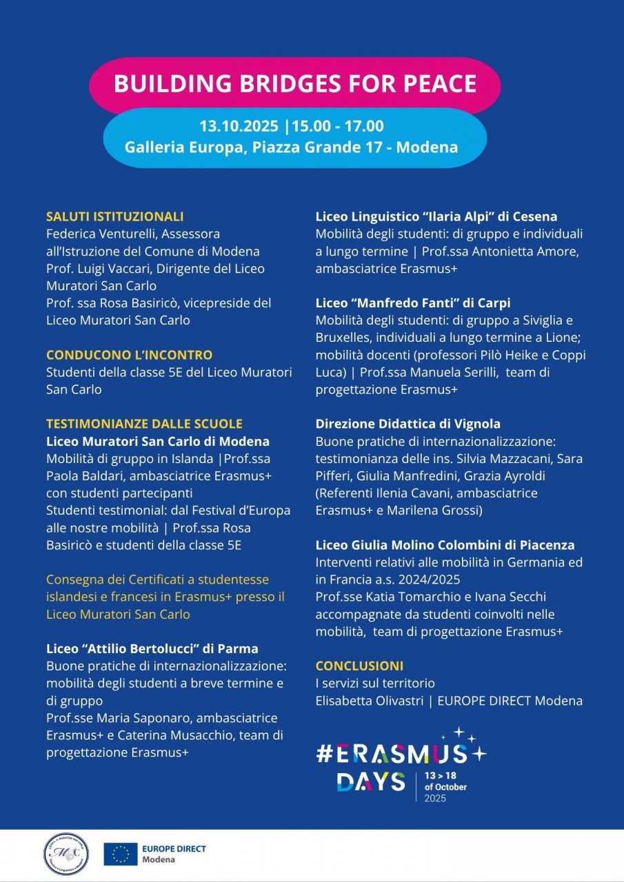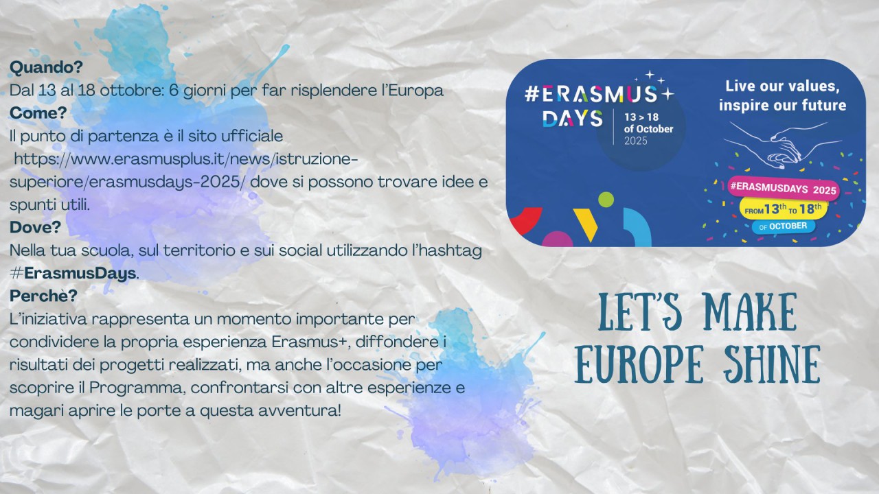 ErasmusDays è una campagna annuale europea di sensibilizzazione e promozione del Programma Erasmus+ che coinvolge protagonisti e beneficiari di tutti i settori attraverso l’organizzazione diffusa di eventi, racconti, incontri, conferenze, presentazioni nei vari Paesi del Programma. La Direzione Didattica ancora una volta sarà coinvolta in questa meravigliosa opportunità di disseminazione. L'evento sulla mappa degli Erasmusdays a questo link