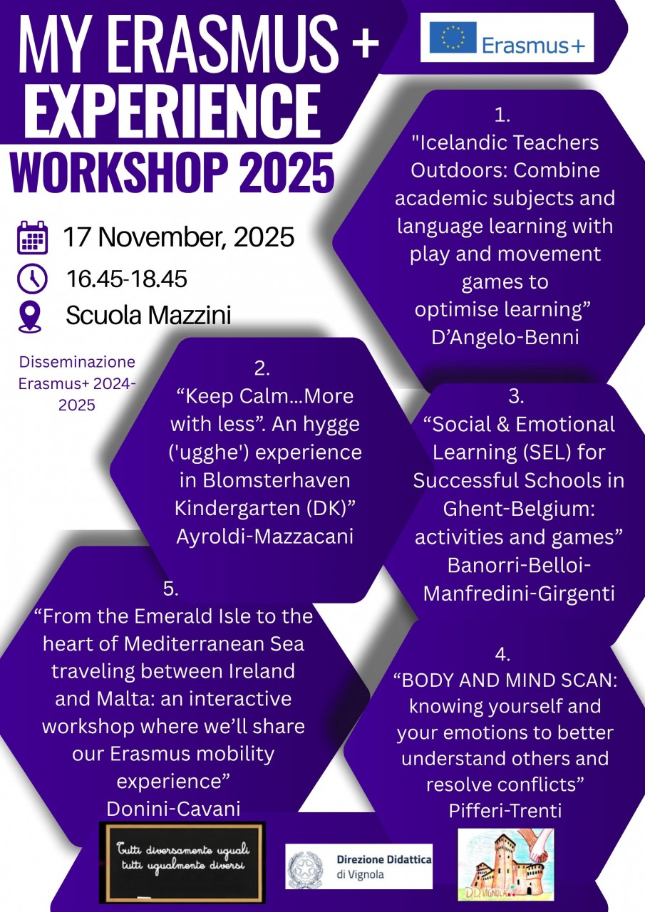 Come ormai da tradizione, in data 17 novembre i docenti della Direzione Didattica di Vignola sono nuovamente invitati a partecipare ai laboratori organizzati dalle docenti coinvolte nella mobilità 2024-2025. In quest'occasione sarà possibile prenotarsi a 2 laboratori e chiedere informazioni all'Infopoint, gestito dalle referenti Erasmus+ e eTwinning. Sarà un momento per favorire lo sviluppo di competenze e conoscenze che consentono di avvicinarsi all'Unione europea e a ciò che questo significa in termini di opportunità, conoscendo meglio il progetto Erasmus+ e lasciandosi ispirare per avviare nuove iniziative di mobilità.